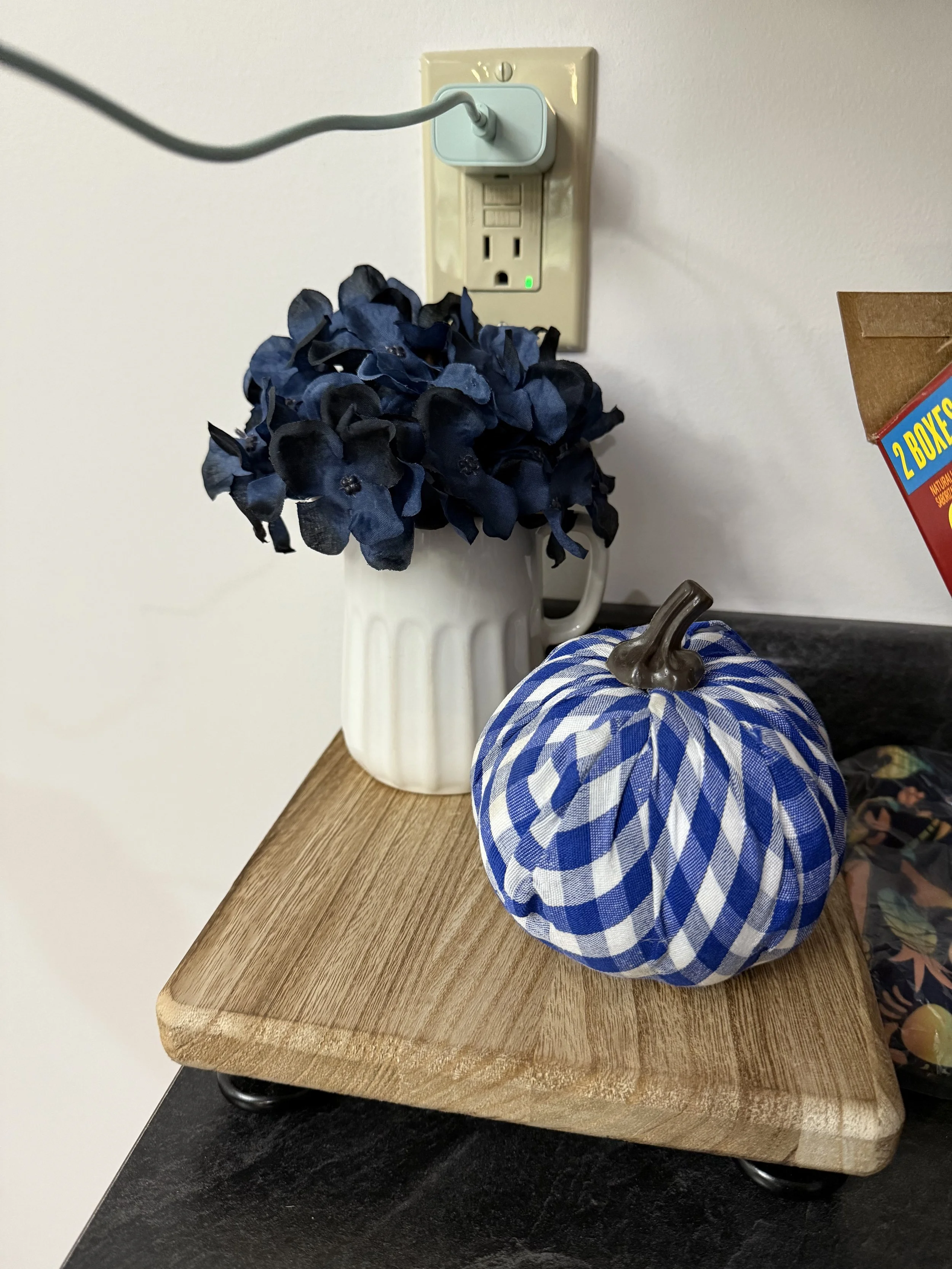 If you hadn’t noticed, I’m loving incorporating the blue and white for fall!! I just think it’s so timeless and classic. It brightens up the space, especially with brown flooring and cabinets. I keep decor pretty light with 3 animals and a house with a very active boy, so this is the gist of it.